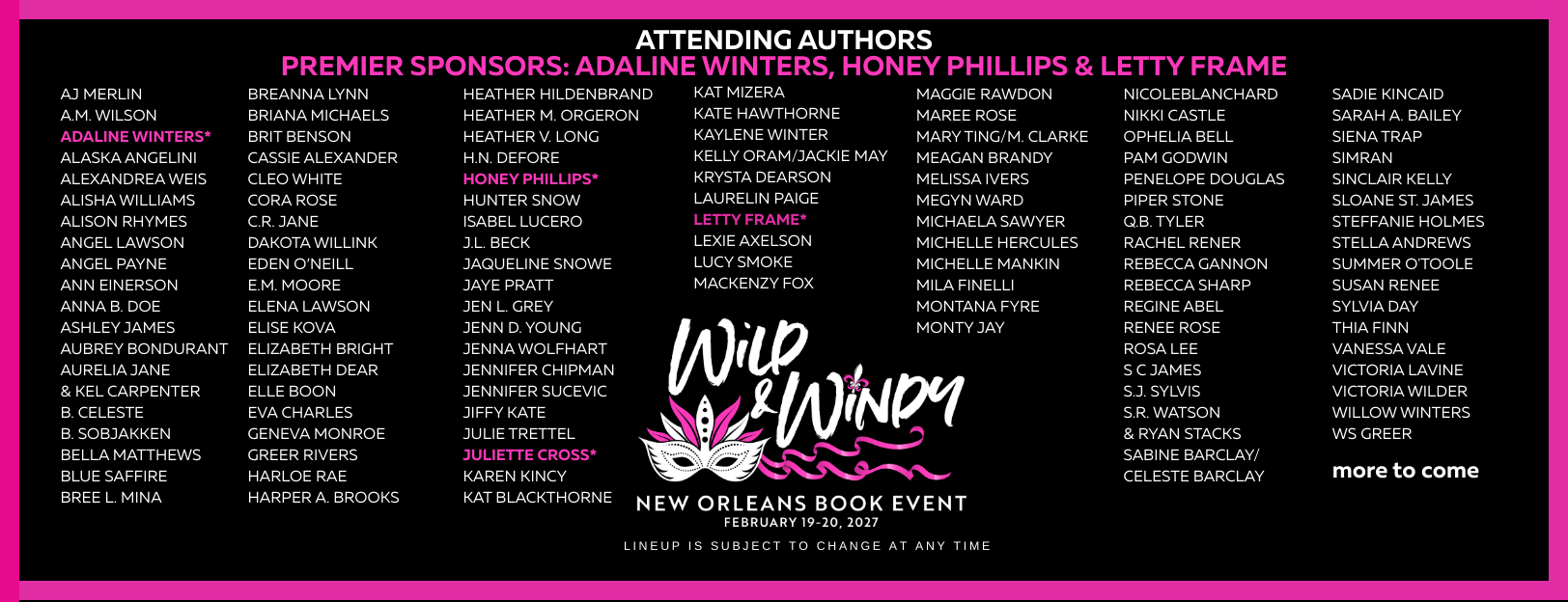 Wild & Windy Book Events are hosted annually in Chicago, New Orleans and Vegas by Nicole Huffman & Michelle Mankin. In past years we have donated to several charities. In 2025 and 2026, we are making donations to the food banks in the cities where our signings are held. To find a local food bank near you, go to FEEDING AMERICA.