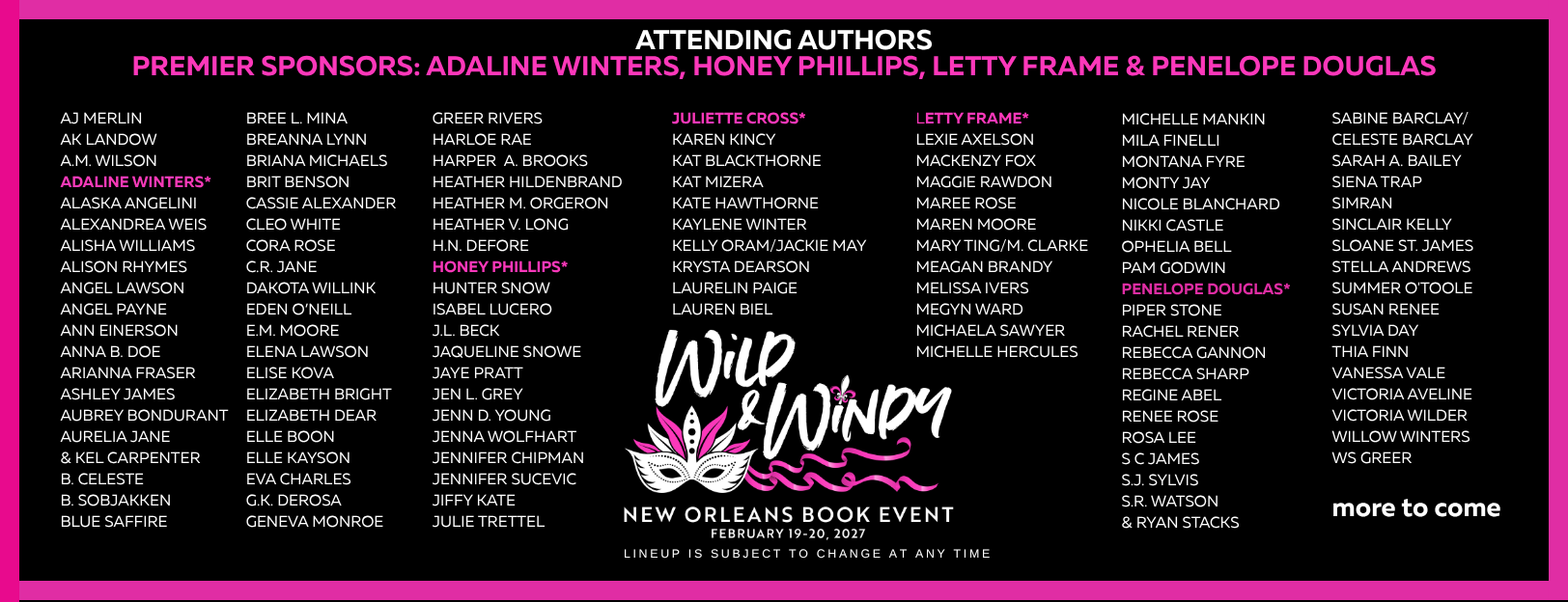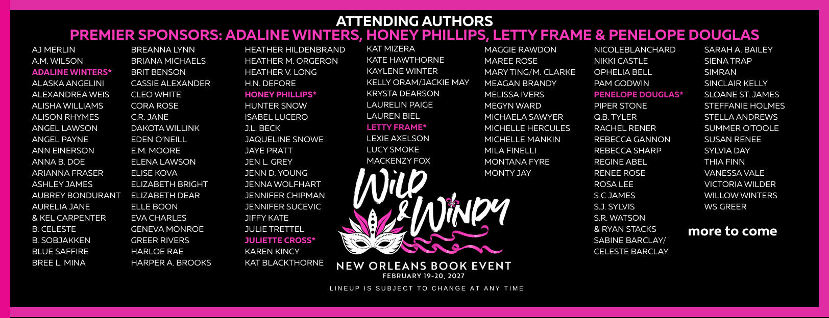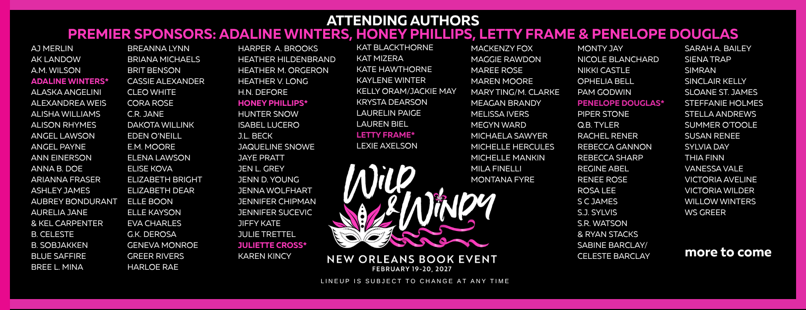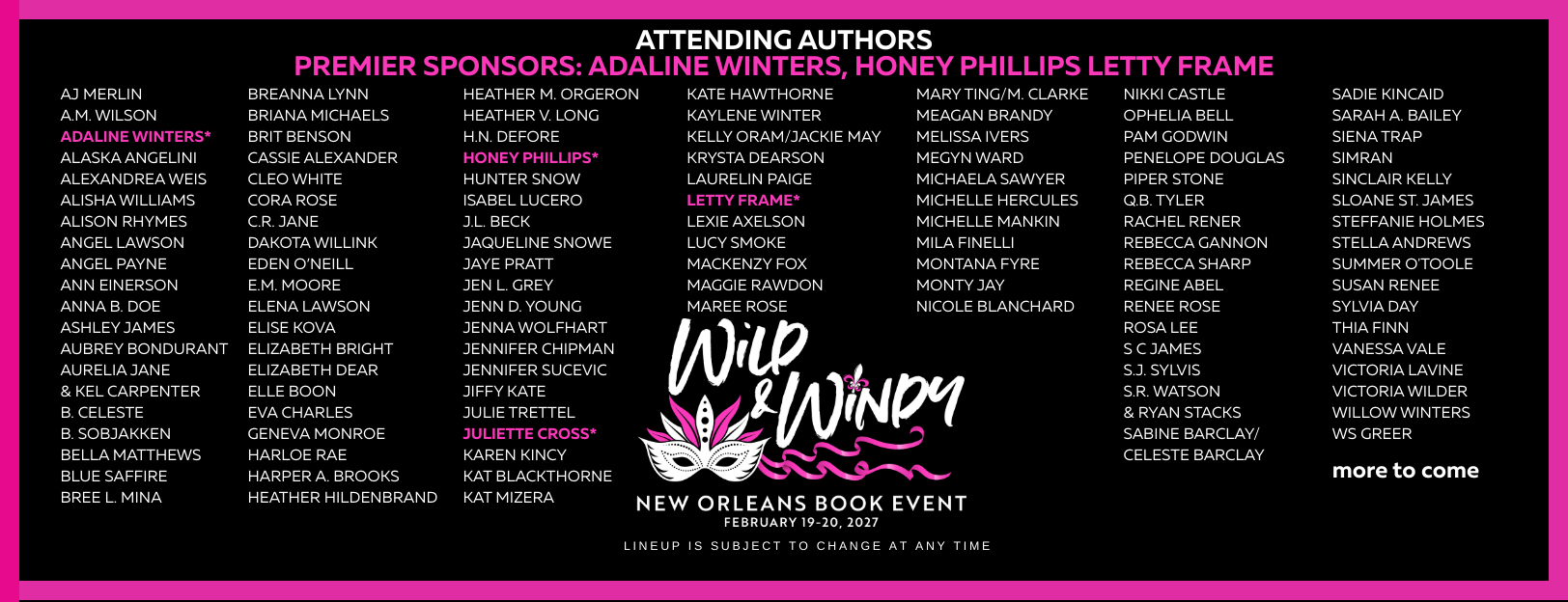 Wild & Windy Book Events are hosted annually in Chicago, New Orleans and Vegas by Nicole Huffman & Michelle Mankin. In past years we have donated to several charities. In 2025 and 2026, we are making donations to the food banks in the cities where our signings are held. To find a local food bank near you, go to FEEDING AMERICA.